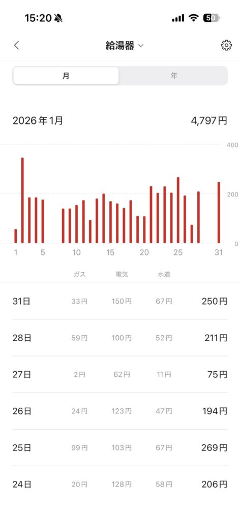 光熱費(12月実績)は電気約15,000円、ガス約8,000円でした。アパート時代より家が広くなり、設備を存分に使っていますが、費用自体は「想定内」に収まっています。これから春に向かってソーラー発電が進むことで、電気代は軽減されると思います。